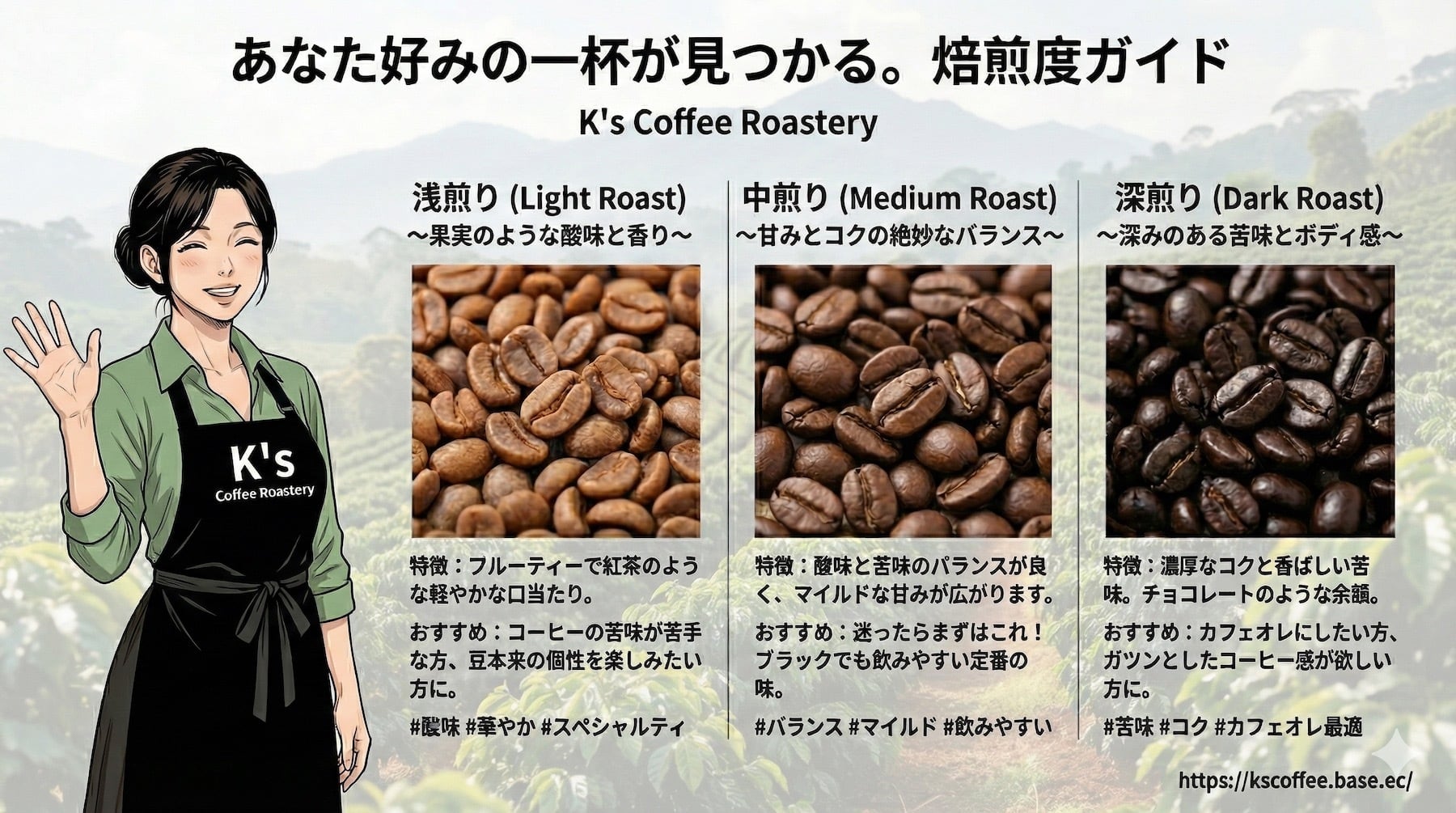 どうぞ、お好みの焙煎度をお選びいただき、心豊かなコーヒータイムをお過ごしください。